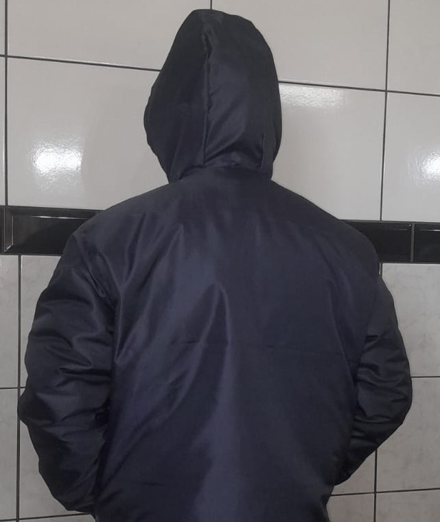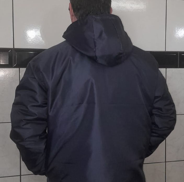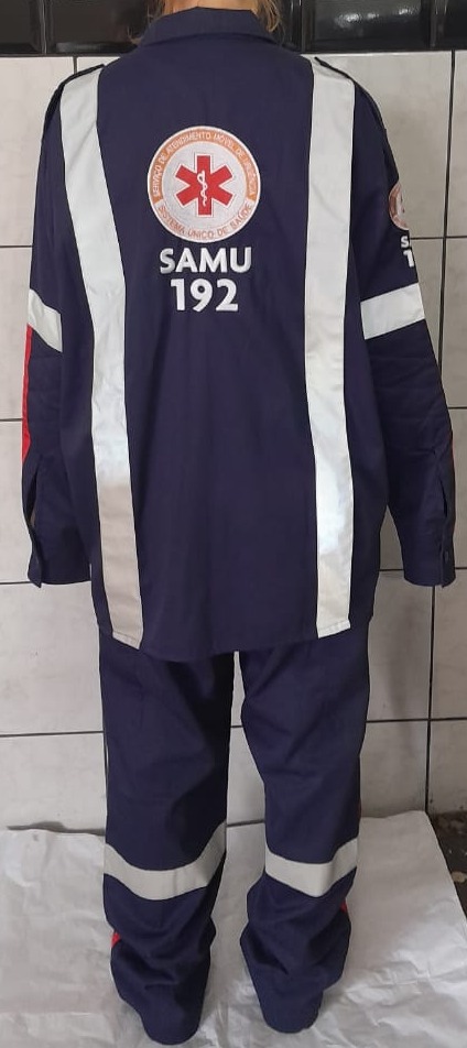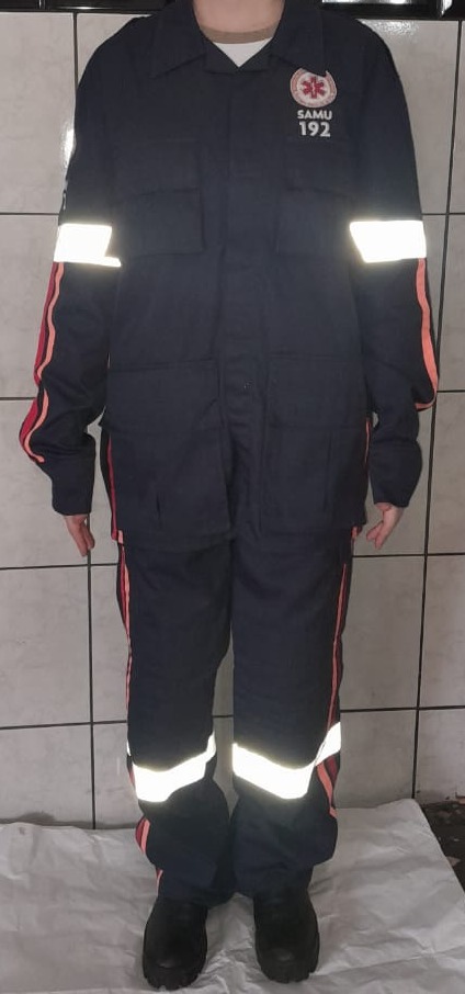 Jaleco em sarja, fechamento frontal por botôes com faixa refletiva.